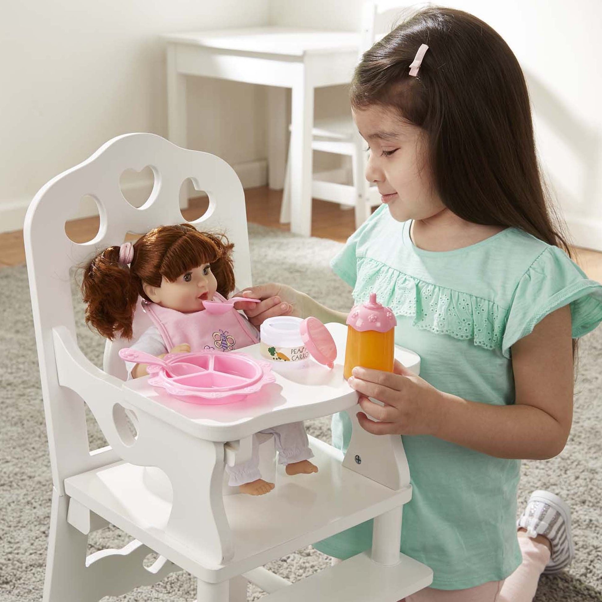 Every mommy knows how important it is to feed a little baby. Now, your little mommy can take care of her baby with this adorable 8-piece set. An easy-close, embroidered bib, keeps baby clean during mealtime which is organized with a divided dish, for