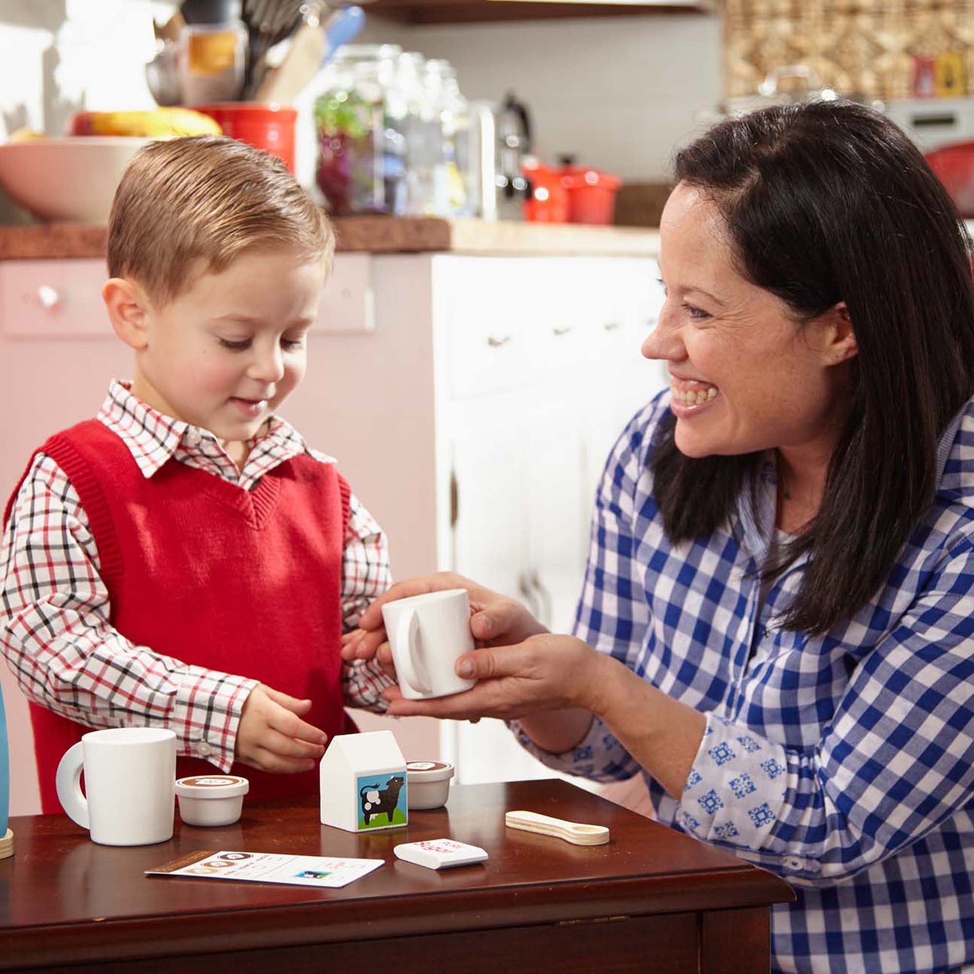 Pretend-play tea parties can now include coffee with this realistic wooden Brew & Serve Coffee Set for two! Lift the lid and pop in one of three coffee pods (regular, hazelnut, or mocha) and turn the knob to choose the serving size! Too hot for cof